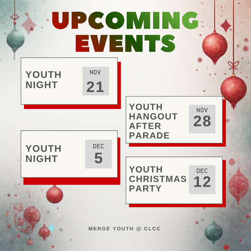 At CLCC Youth, we meet from 7-9pm on Fridays. We'll take some time to connect and play games, have some food and conversation around tables, and have a safe place to ask absolutely any questions that you may have about Faith, life, or anything else.